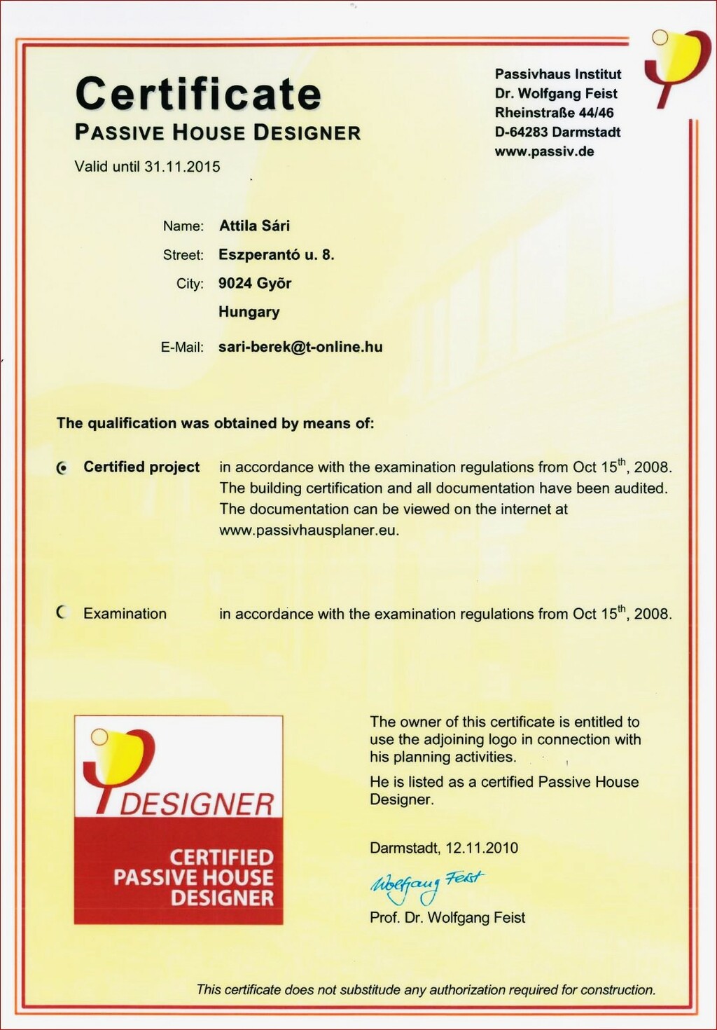 minősített passzívháztervező CEPHD